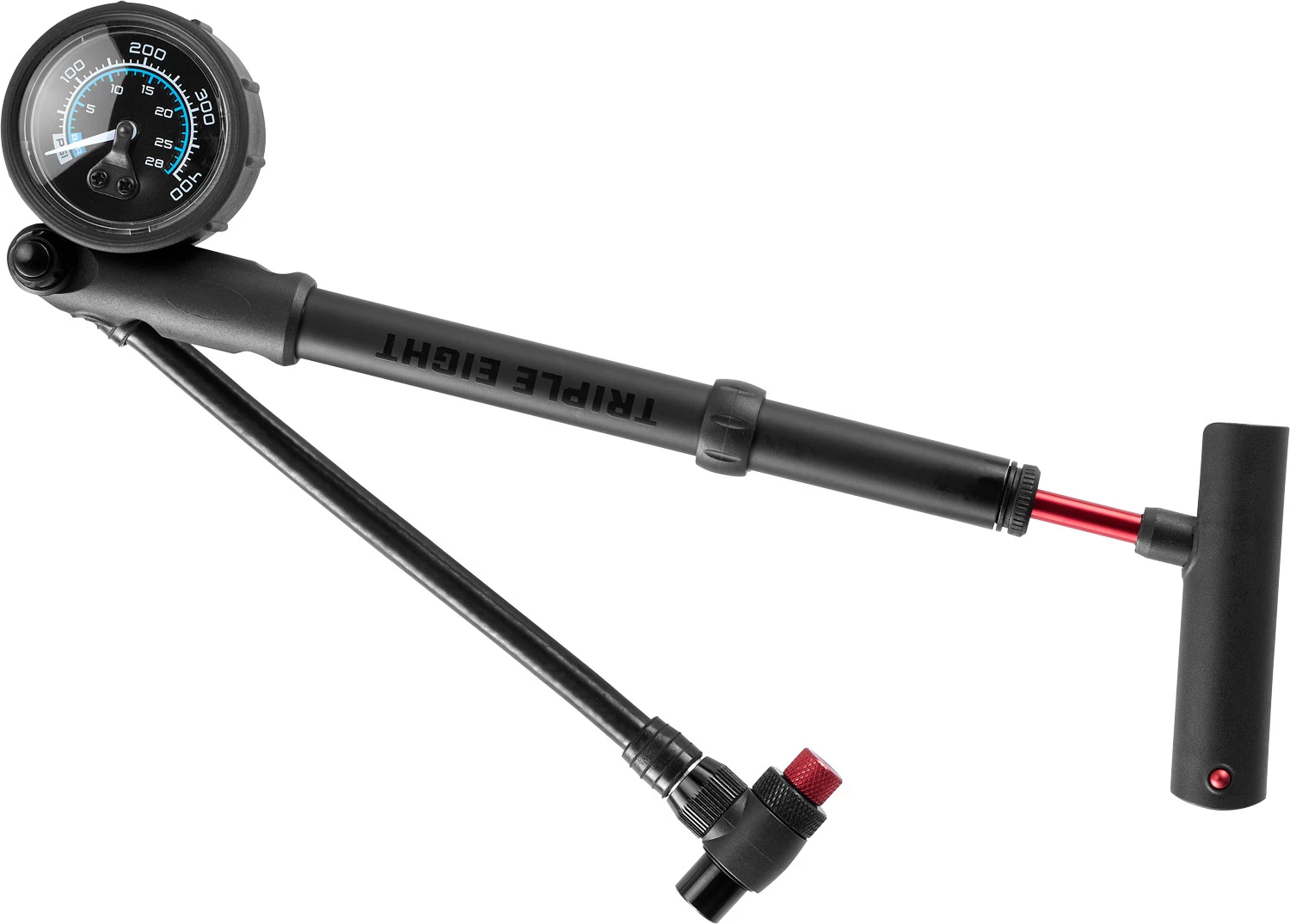 Cela vous permet d’adapter la fourche et l’amortisseur de la suspension à vos souhaits. La tête de la valve Schrader brevetée de la pompe à chocs TRIPLE EIGHT empêche l’air de s’échapper lorsqu’elle est relâchée. Le manomètre indique une pression d’air allant jusqu’à 400 psi et la poignée en forme de T permet un confort maximal lors du pompage.